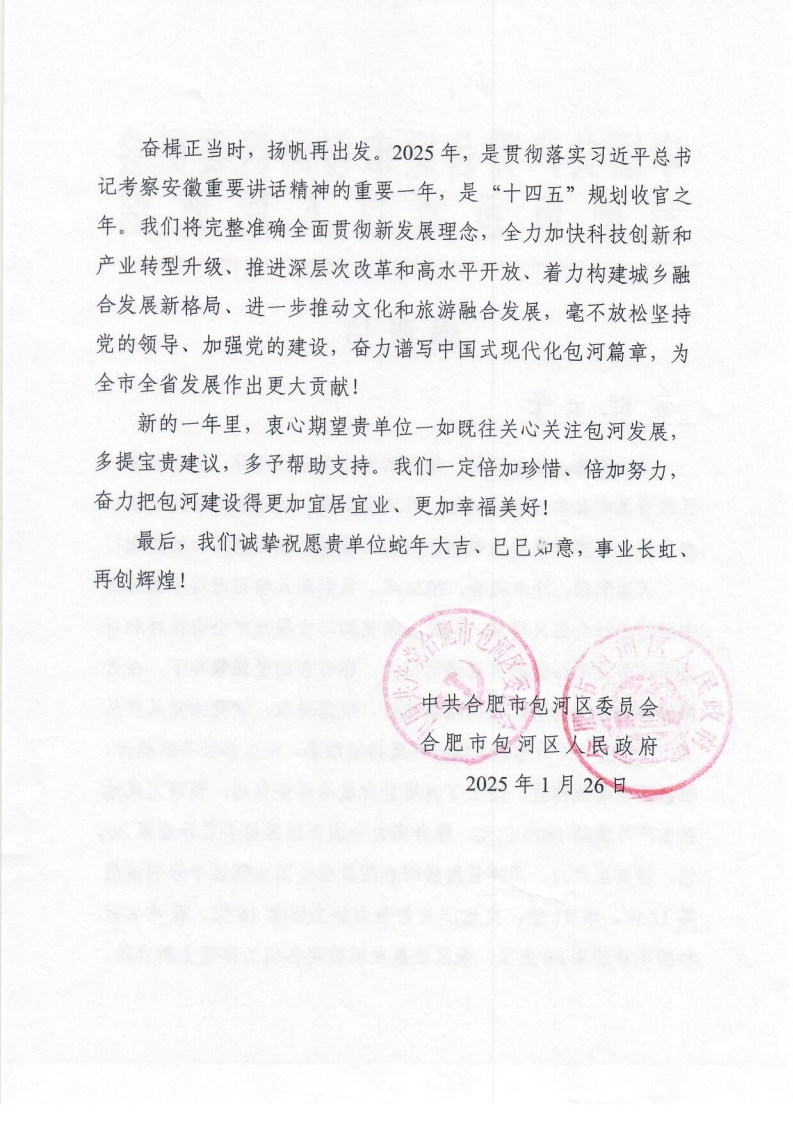 正值岁末,我校收到了来自合肥市包河区委区政府发来的感谢信。信中,包河区委区政府对我校给予包河区的关心帮助致以衷心感谢。