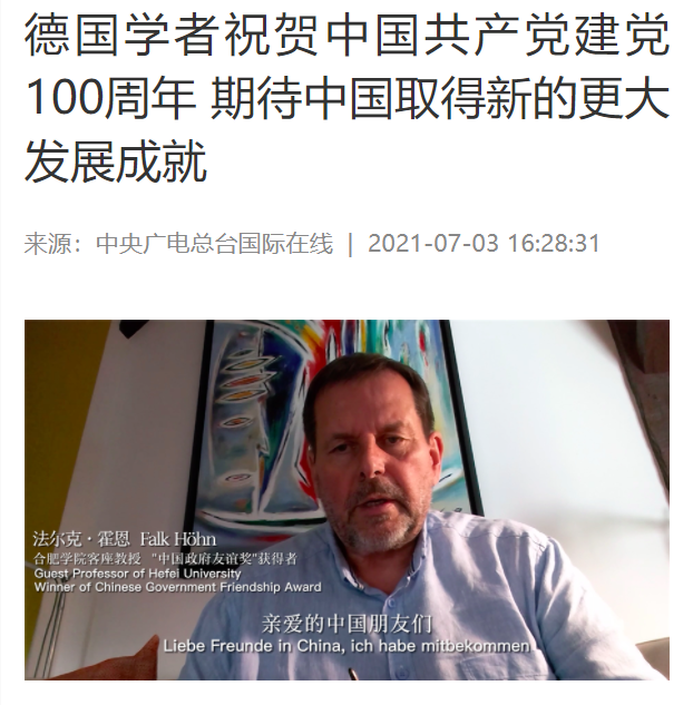 “衷心祝贺中国共产党100岁华诞,并祝愿你们取得更大的成就!”在中国共产党成立100周年之际,我校德国专家、中国政府友谊奖获得者、德国施特拉尔松德孔子学院德方院长法尔克·霍恩教授,安徽省人民政府黄山友谊奖获得者、德国奥斯纳布吕克应用科学大学教授米夏尔·舒勒和来汉瑞送上诚挚的祝福。他们高度评价了中国近年来在经济、社会各发展领域中所取得的伟大成就,对中国共产党百年征程铸就的辉煌历史表示赞赏,并期待中国在共产党领导的新征程中开创更加美好的未来。对此,央视新闻、中央广电总台国际在线、中国新闻网等多家主流媒体纷纷予以报道。