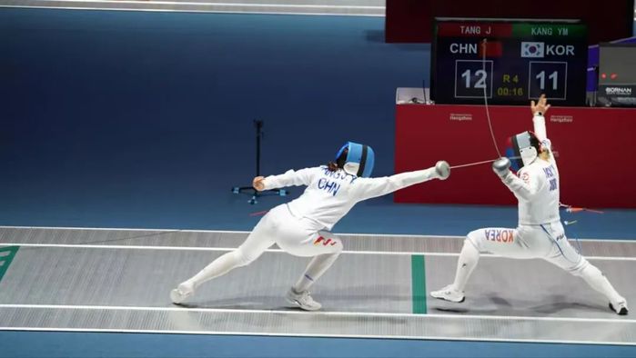 9月27日下午,杭州亚运会女子团体重剑比赛在杭州电子科技大学体育馆举行,我校击剑高水平运动员、经济与管理学院唐君瑶同学所在的中国队获得女子团体重剑项目铜牌。