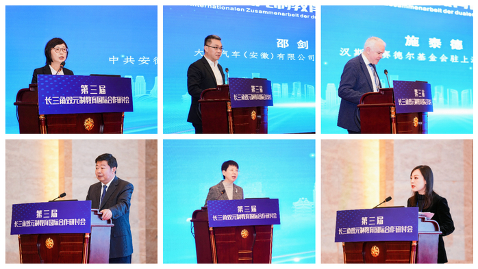 安徽省教育厅二级巡视员朱乃韬、江苏省教育厅副厅长曹玉梅、德国海外商会联盟大中华区高级经理戴秋芳、安徽省汽车行业协会会长石琴分别作主旨报告。报告展现了安徽与江苏两省在双元制教育国际合作方面的探索、实践与成效,展示了德国海外商会大中华区与国内诸多高校的合作项目与成果,以及安徽省汽车行业协会在与高校合作开展双元制教育模式方面的成功实践。
