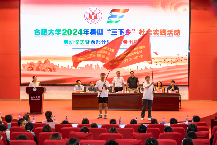 仪式上,校团委书记张应杰介绍今年暑期“三下乡”社会实践活动的团队组建情况。学生志愿者邬逸凡表达了参加“三下乡”暑期社会实践的强烈意愿。马克思主义学院教师王霞对学生调研工作提出了有效的建议。出席会议的领导依次为全国重点团队、全国专项及省级专项团队、校级重点团队学生代表授旗,为28名西部计划志愿者颁发纪念品。