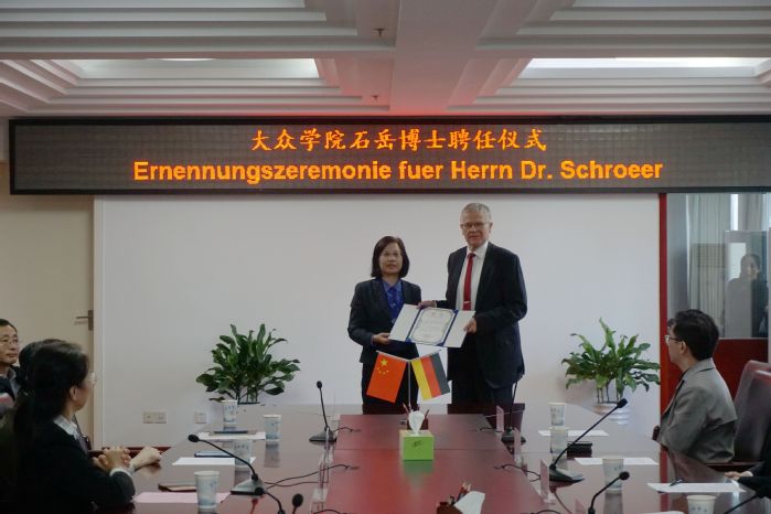 10月8日上午,学校举行特聘教授聘任仪式,全职聘请大众集团前高管、工程师石岳博士(Dr. Klaus Schröer)为大众学院特聘教授。院长吴春梅,组织部部长白义香,教务处处长、大众学院院长王晓峰,人事处处长纪平,国际交流合作处处长张慧,大众学院直属党支部书记宣跃文,先进制造工程学院院长胡学友及相关教师出席。大众安徽首席制造官施耐德博士(Harry Schneider),大众安徽效率管理总监朱江萍,大众安徽维修部总监亨德里克·迪普(Hendrik Dippe)受邀出席。仪式由副院长陈秀主持。